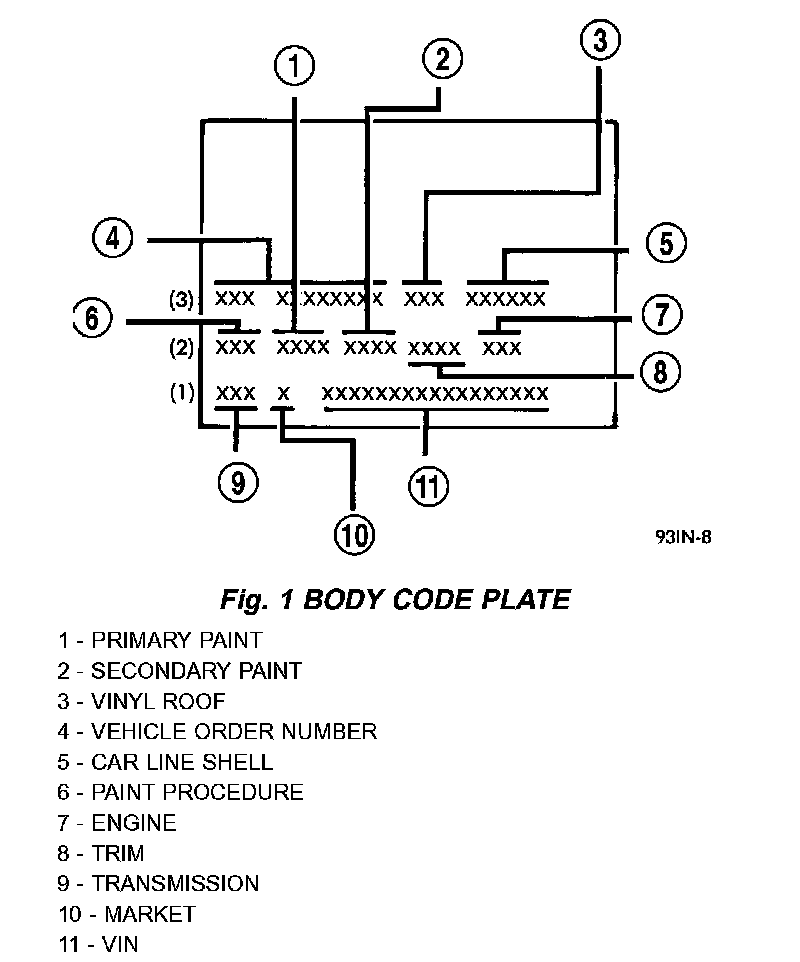 The Body Code Plate (Fig. 1) is located in the engine compartment on the radiator closure panel crossmember. There are seven lines of information on the body code plate. Lines 4, 5, 6, and 7 are not used to define service information. Information reads from left to right, starting with line 3 in the center of the plate to line 1 at the bottom of the plate.