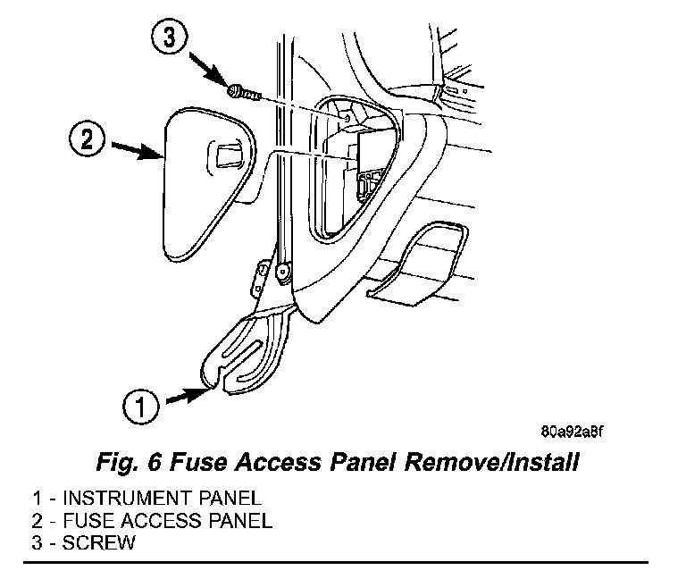 2. Remove the fuse access panel by unsnapping it from the left outboard end of the instrument panel (Fig. 6).