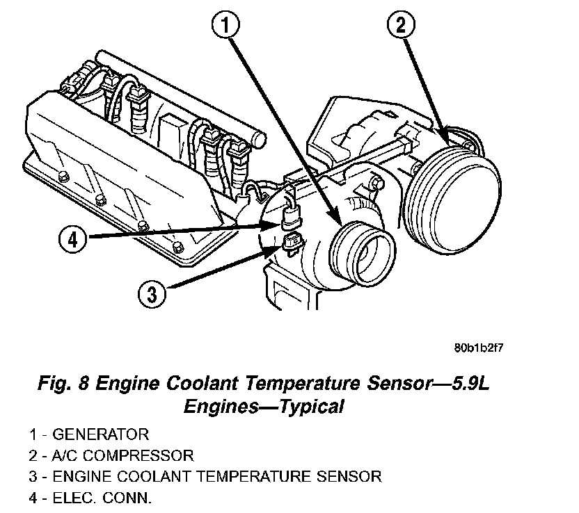 The engine coolant temperature sensor is installed into a water jacket at front of intake manifold near rear of generator.