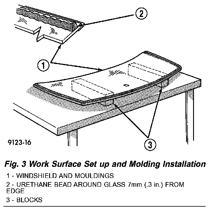 3. Position the windshield inside up on a suitable work surface with two padded, wood 10 cm by 10 cm by 50 cm (4 in. by 4 in. by 20 in.) blocks, placed parallel 75 cm (2.5 ft.) apart (Fig. 3).