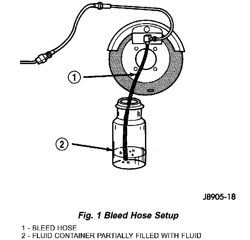 3. Attach one end of bleed hose to bleed screw and insert opposite end in glass container partially filled with brake fluid. Be sure end of bleed hose is immersed in fluid.