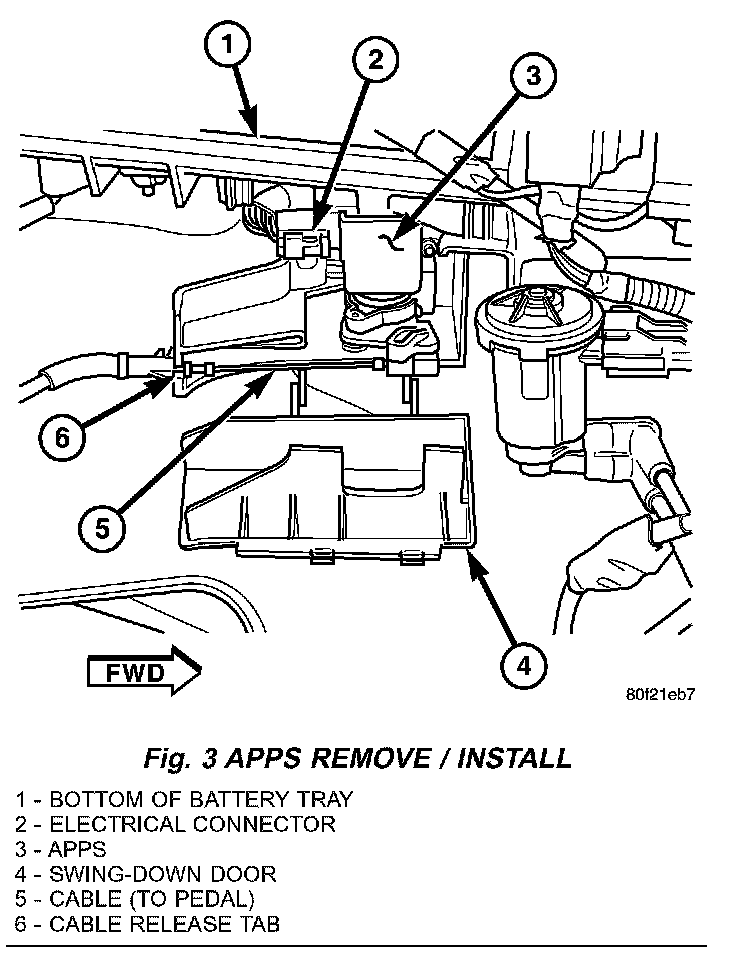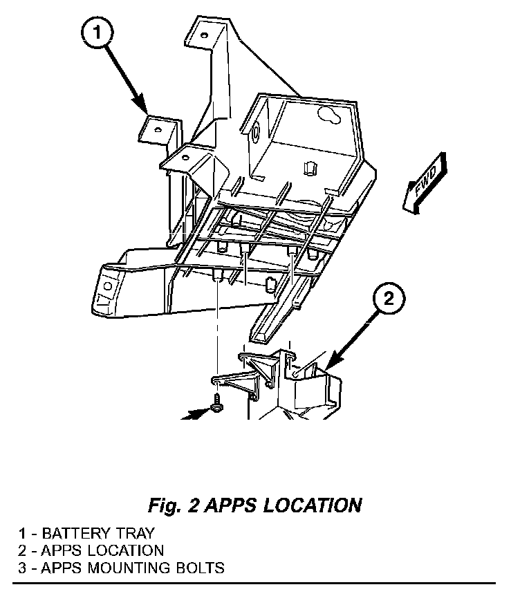 The APPS is serviced (replaced) as one assembly including the sensor, plastic housing and cable. The APPS assembly is located under the vehicle battery tray. Access to APPS is gained from over top of left / front tire.