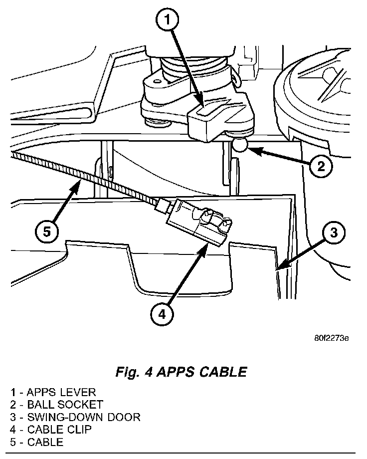 7. If cable is to be separated at APPS, unsnap cable clip from ball socket. Release cable from plastic housing by pressing on small cable release tab.
