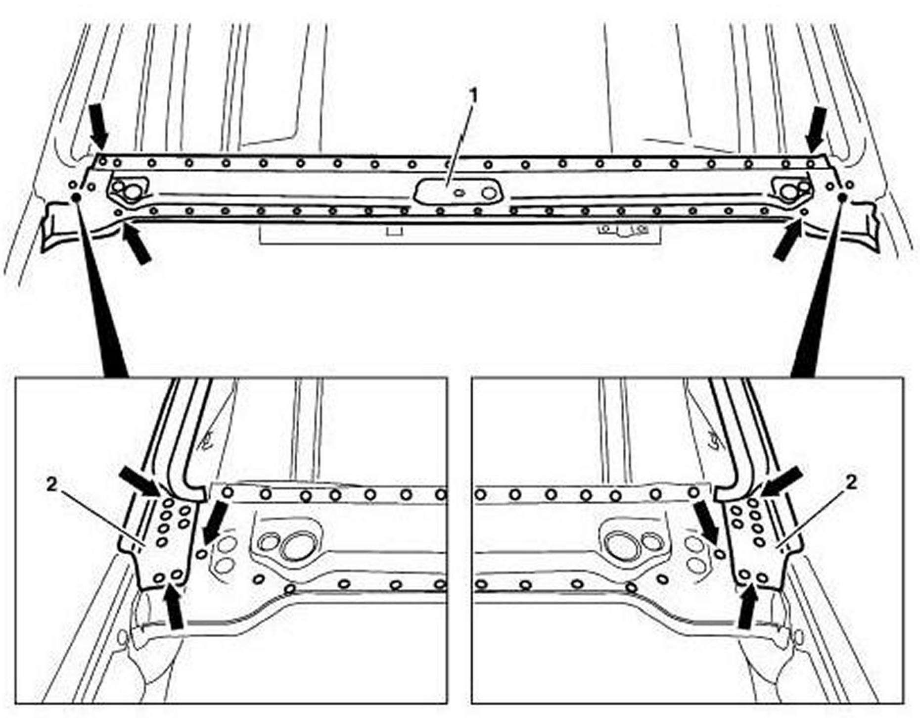 4. Spot weld waist rail paneling (1) to waist rail brace (arrows).