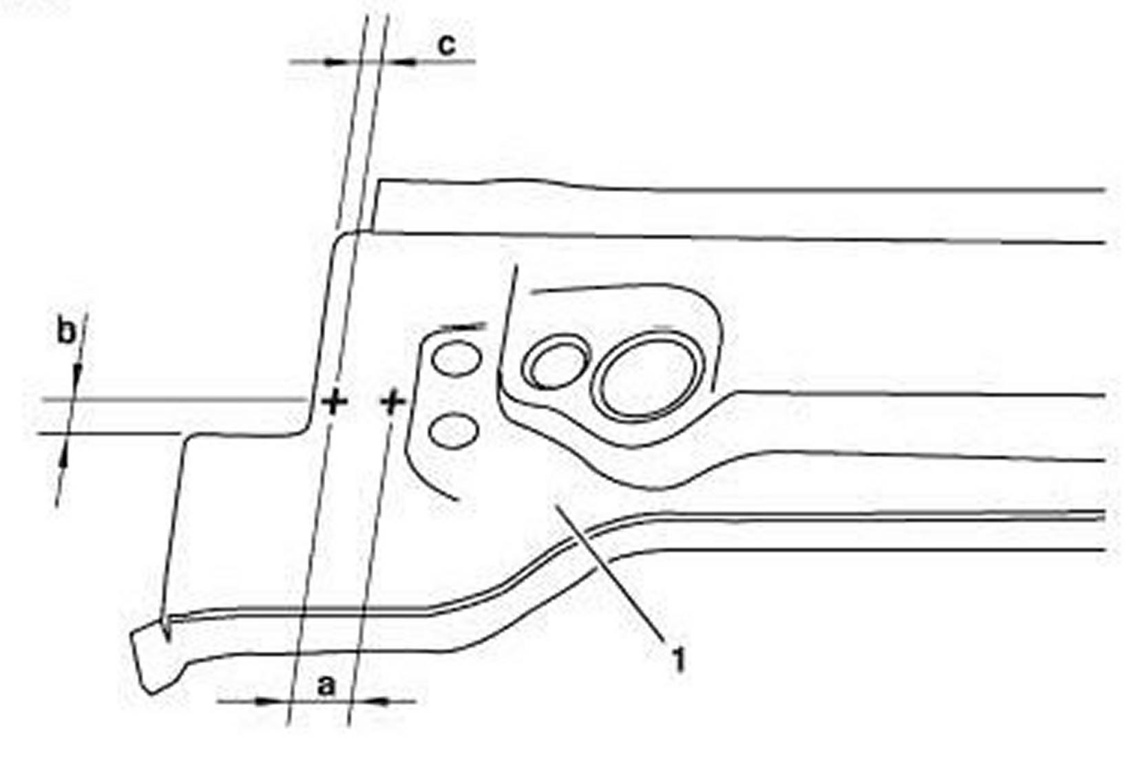 1. Cut spot welds out of waist rail paneling (1) and A-pillar paneling (2).