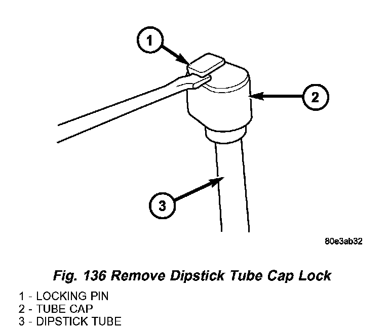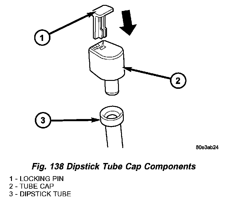 10. Once the oil level is correct, install a new dipstick tube cap (2) (Fig. 138) and lock pin (1).