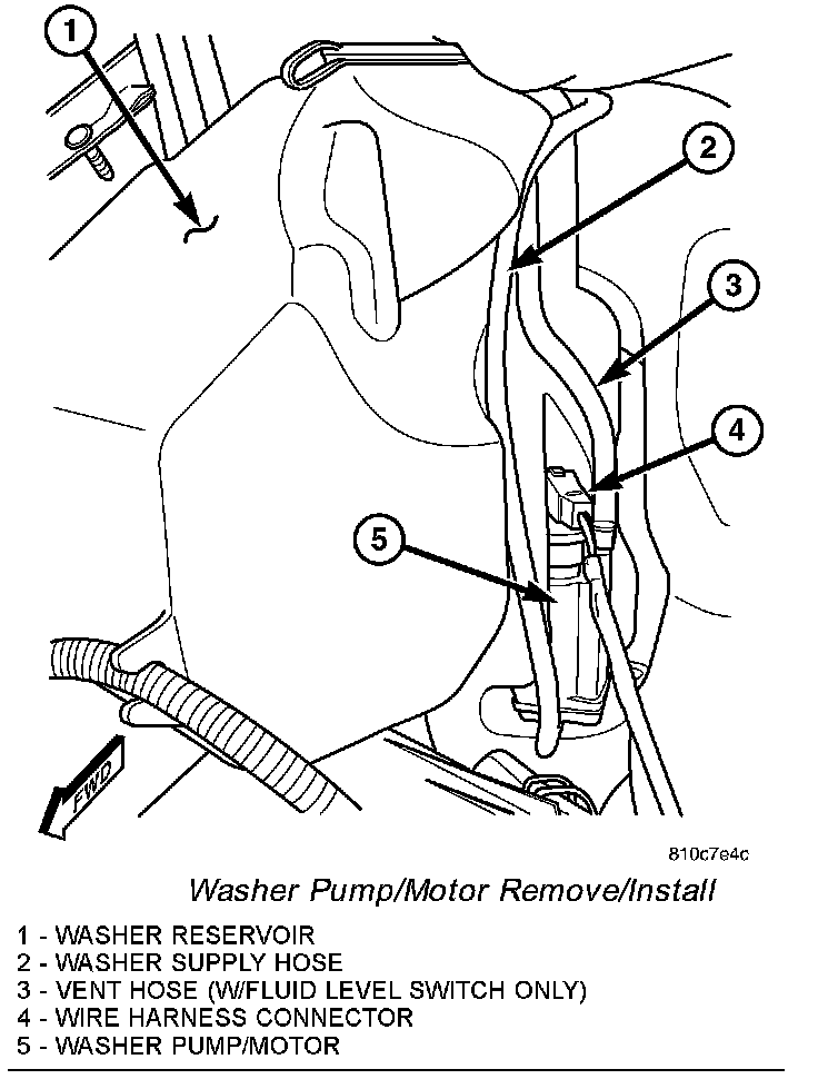 4. If the vehicle is so equipped, reconnect the washer fluid level switch vent hose to the barbed vent nipple at the top of the washer pump/motor housing.