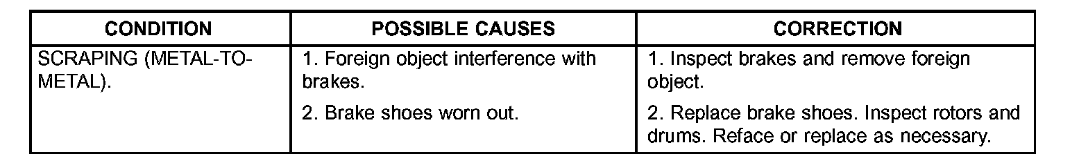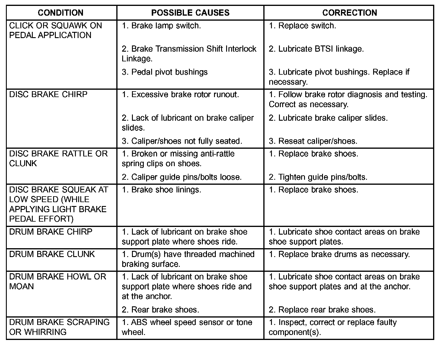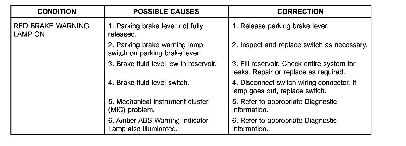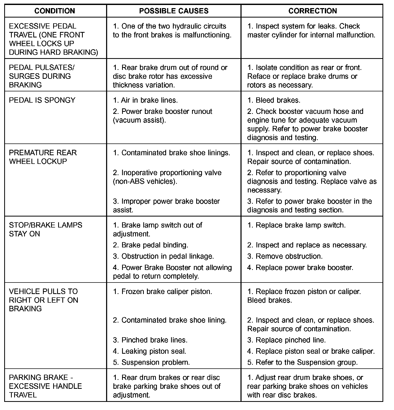 DIAGNOSIS AND TESTING - BASE BRAKE SYSTEMNOTE: There are three diagnosis charts following that cover the RED BRAKE WARNING INDICATOR LAMP, BRAKE NOISE and OTHER BRAKE CONDITIONS.