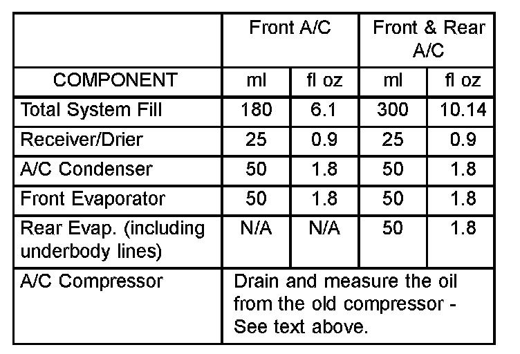 components (except the A/C compressor) are refrigerant oil free. After the refrigerant system has been charged with (R-134a) refrigerant and operated, the oil in the A/C compressor is dispersed through the lines and components. The A/C evaporator, A/C condenser, and receiver/drier will retain a significant amount of oil. Refer to the A/C Component Refrigerant Oil Capacities table. When a component is replaced, the specified amount of refrigerant oil must be added. When the compressor is replaced, the amount of oil that is retained in the rest of the system must be drained from the replacement A/C compressor. The oil capacity of the system, minus the amount of oil still in the remaining components (refer to the oil capacity chart below) can be measured and poured into the suction port of the A/C compressor. When a line or component has ruptured and oil has escaped, the receiver/drier must be replaced along with the ruptured component.