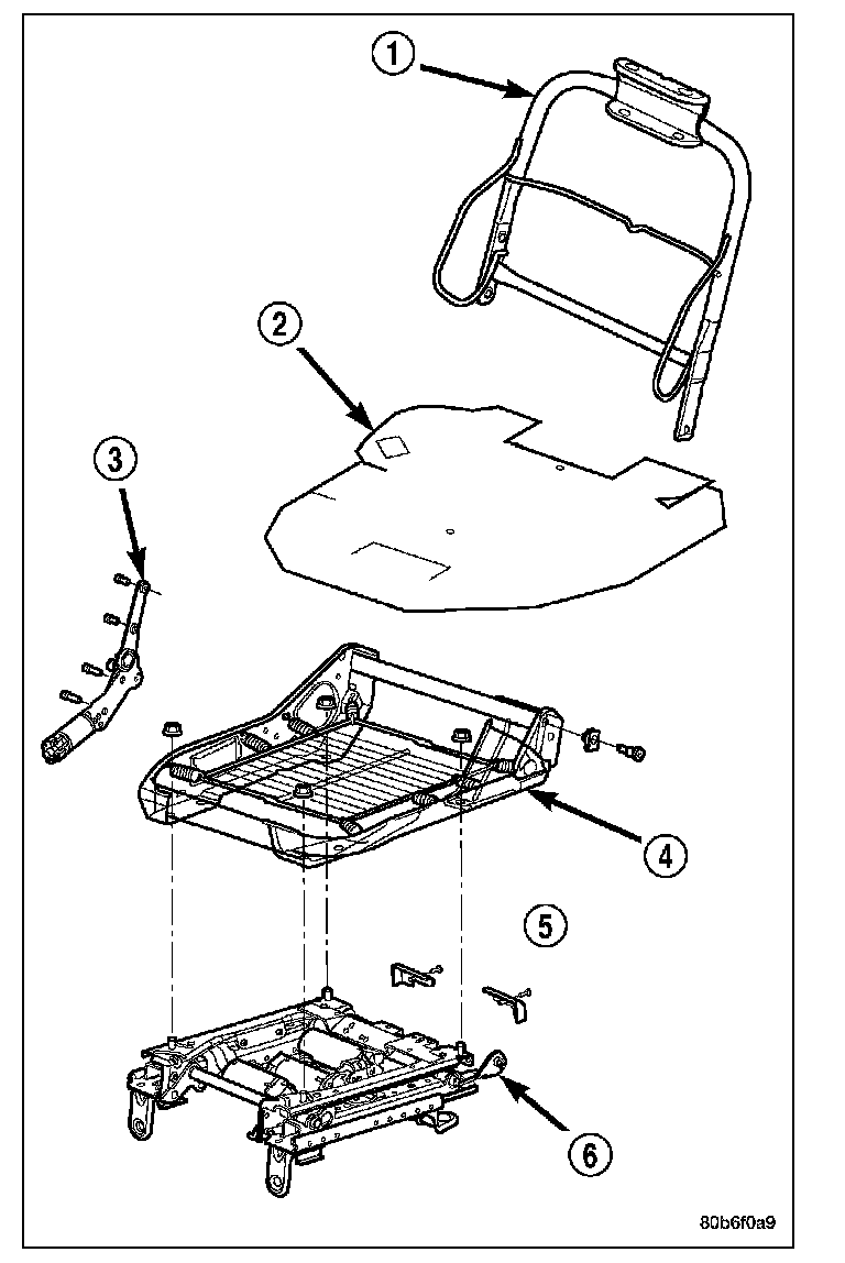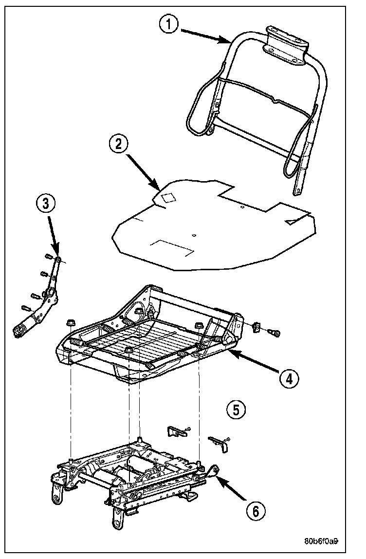 2. Install bolts attaching recliner (3) to seat back frame (1) and tighten to 28 Nm (20 ft. lbs.).