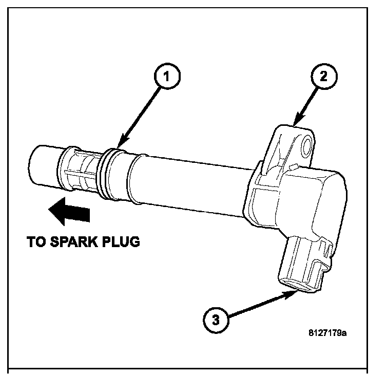 REMOVALAn individual ignition coil is used for each spark plug (2). The coil fits into machined holes in the cylinder head. A mounting stud/nut secures each coil to the top of the intake manifold. The bottom of the coil is equipped with a rubber boot to seal the spark plug to the coil. Inside each rubber boot is a spring. The spring is used for a mechanical contact between the coil and the top of the spark plug. These rubber boots and springs are a permanent part of the coil and are not serviced separately. An O-ring (1) is used to seal the coil at the opening into the cylinder head.