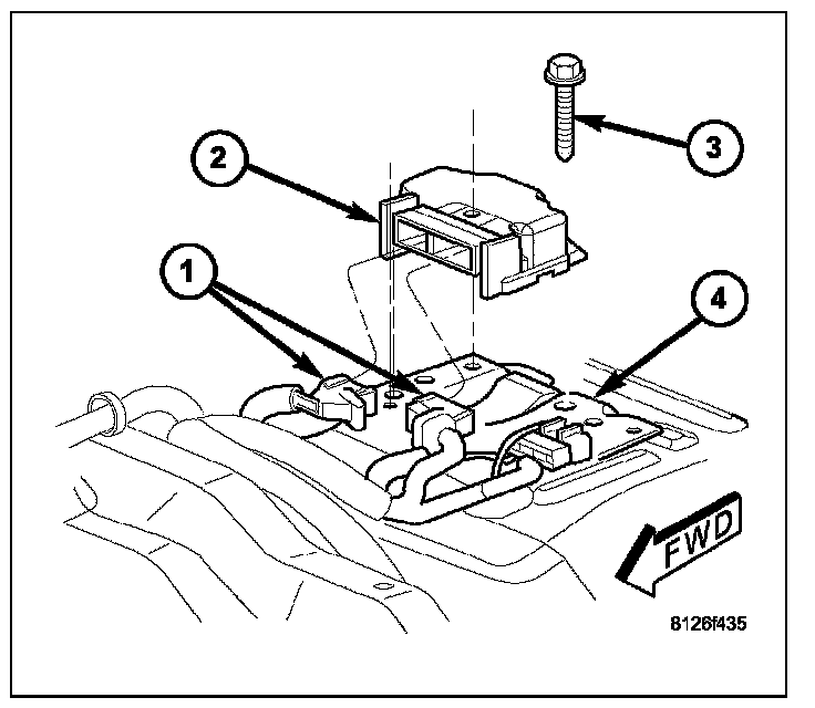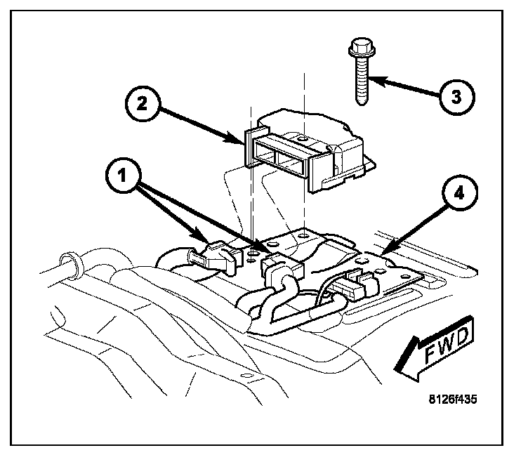 4. Remove the three screws (3) that secure the ORC to the ORC bracket (4) that is welded onto the top of the floor panel transmission tunnel.