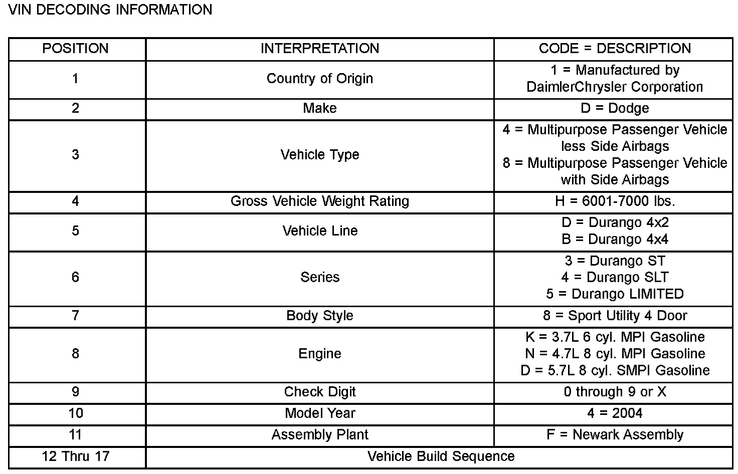 The Vehicle Identification Number (VIM) plate is attached to the top left side of the instrument panel. The VIN contains 17 characters that provide data concerning the vehicle. Refer to the decoding chart to determine the identification of the vehicle.