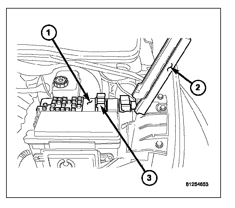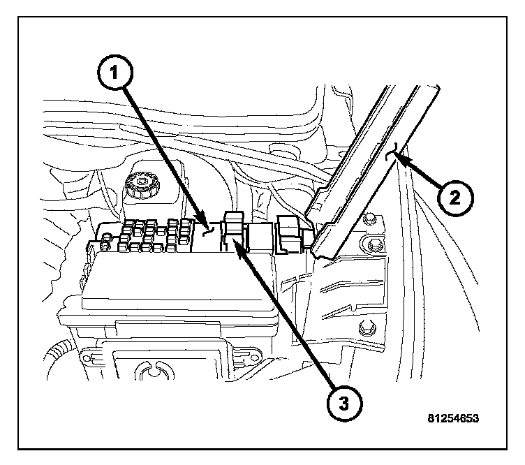 1. Position the A/C clutch relay (3) into the proper receptacle of the PDC (1).