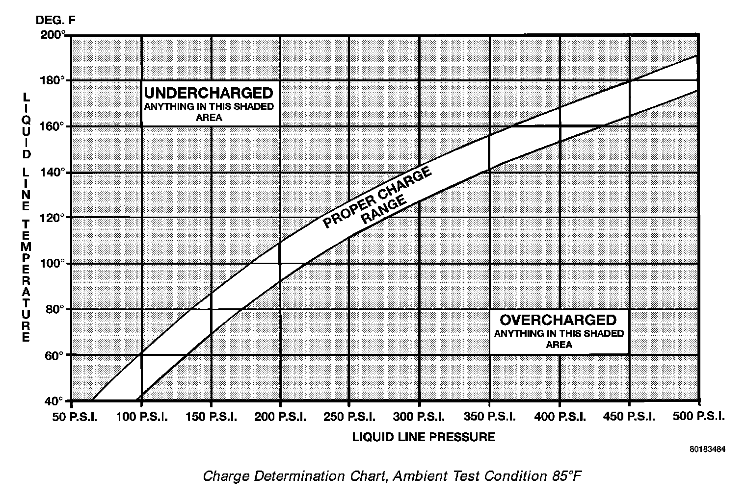 5. Observe the liquid line (discharge) pressure and liquid line temperature. Using the Charge Determination Chart, determine whether the refrigerant system is operating within the Proper Charge Range.
