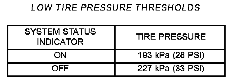 The SKREEM monitors the signals from the tire pressure sensor/transmitters and determines if any tire has gone below the low pressure threshold LOW TIRE PRESSURE THRESHOLDS table.