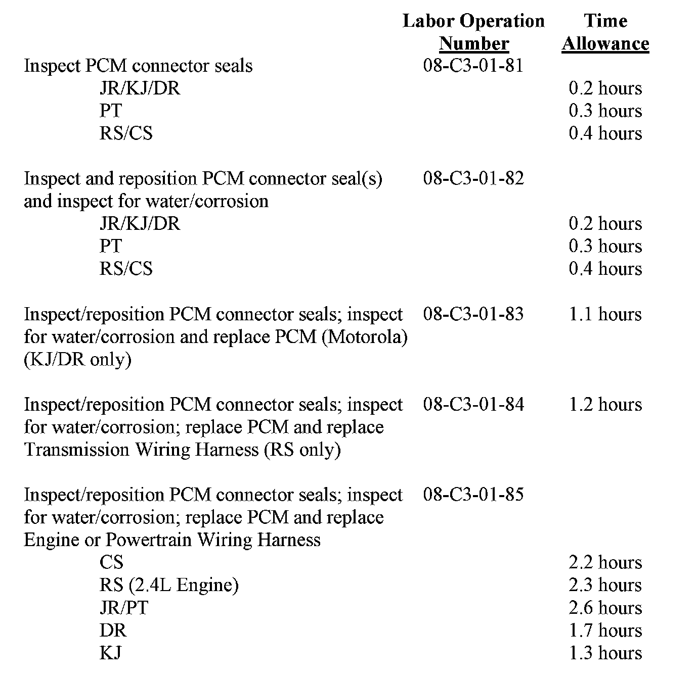 Use one of the labor operation numbers and time allowances shown.