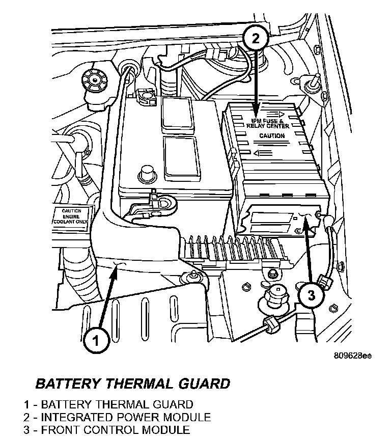 The Integrated Power Module (IPM) is a combination of the Power Distribution Center (PDC) and the Front Control Module (FCM). The IPM is located in the engine compartment, next to the battery on this model. The power distribution center mates directly with the Front Control Module (FCM) to form the IPM Fuse and Relay Center. The power distribution center (PDC) is a printed circuit board based module that contains fuses and relays, while the front control module contains the electronics controlling the IPM and other functions. This IPM connects directly to the battery positive via a four pin connector. The ground connection is via two other connectors. The IPM provides the primary means of voltage distribution and protection for the entire vehicle.