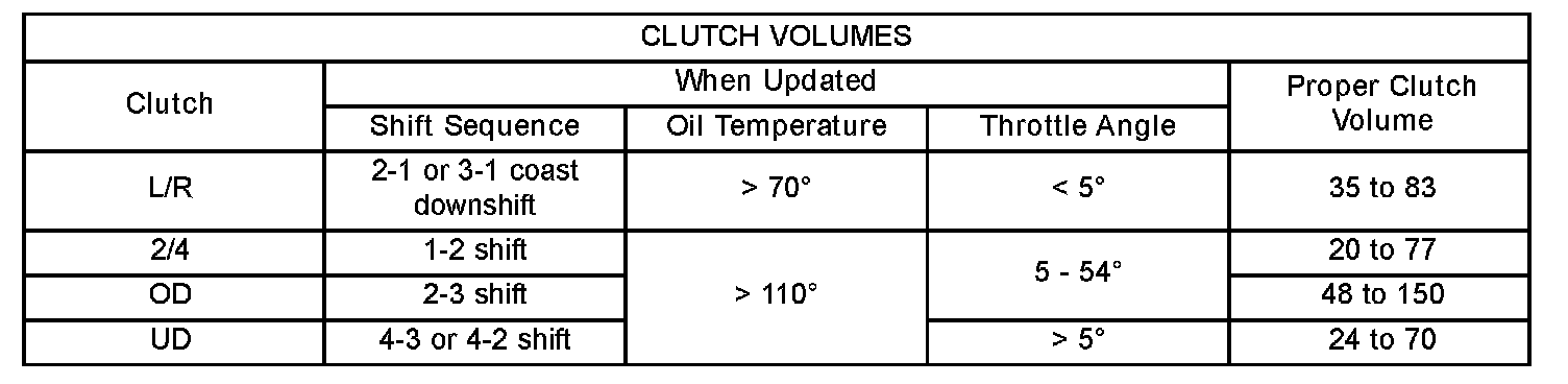 Certain mechanical problems within the clutch assemblies (broken return springs, out of position snap rings, excessive clutch pack clearance, improper assembly, etc.) can cause inadequate or out-of-range clutch volumes. Also, defective Input/Output Speed Sensors and wiring can cause these conditions. The following chart identifies the appropriate clutch volumes and when they are monitored/updated: