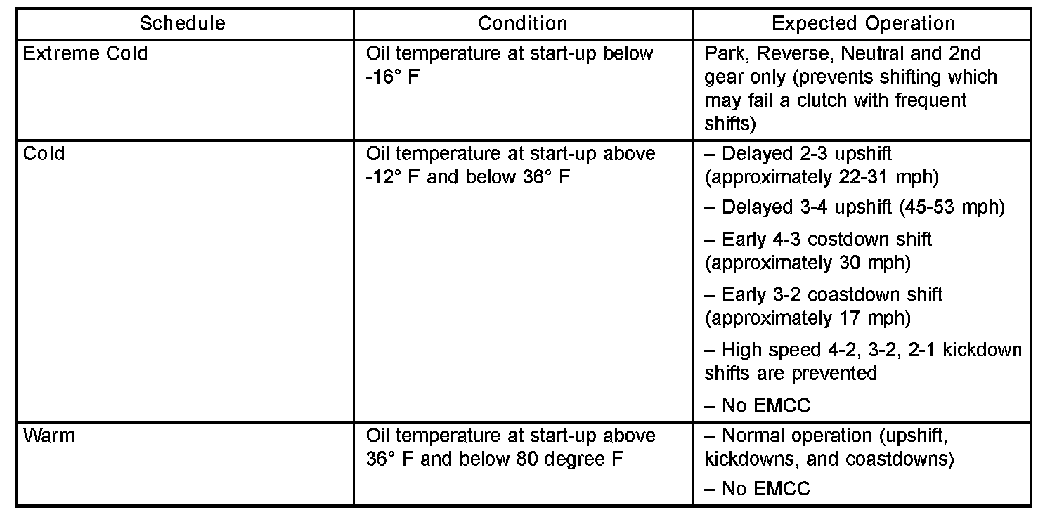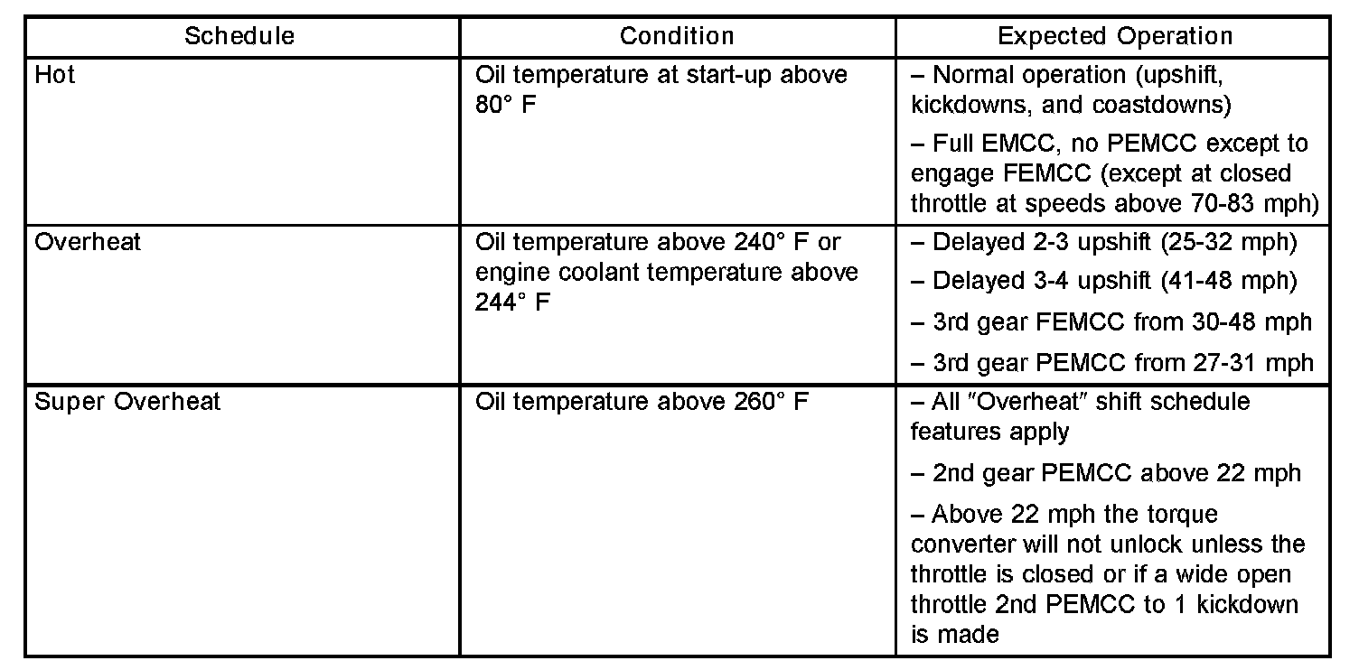 As driving conditions change, the PCM appropriately adjusts the shift schedule. Refer to the chart to determine the appropriate operation expected, depending on driving conditions.