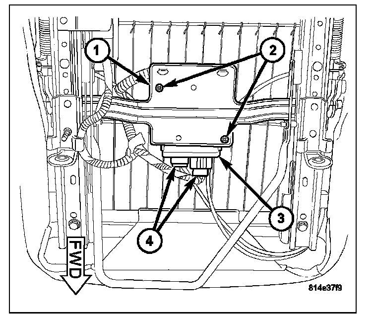3. Reconnect the body wire harness and seat wire harness connectors to the OCM connector receptacles (4) located on the forward facing end of the module. Be certain that the latches and locks on both connectors are each fully engaged.