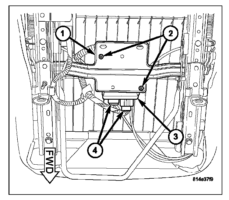 2. Reach under the front edge of the passenger side front seat cushion to access and disconnect the body wire harness and seat wire harness connectors from the Occupant Classification Module (OCM) connector receptacles (4) located on the forward facing end of the module.
