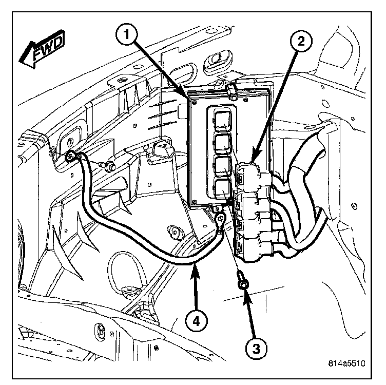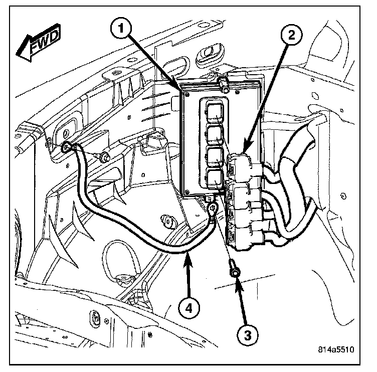 4. Be sure ground strap (4) is secured both at bottom of PCM, and at inner-fender.