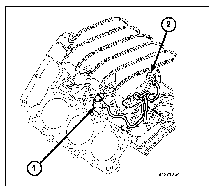 REMOVALThe 2 knock sensors are bolted into the cylinder block under the intake manifold (1) and (2).