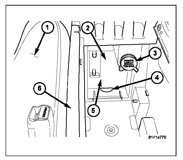 6. Install the power outlet panel (5) by engaging the upper tabs into the console (6) and pushing the bottom forward until it snaps into place.