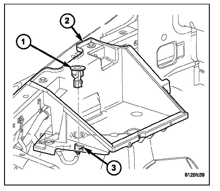 REMOVALThe battery temperature sensor (1) is located under vehicle battery and is attached to a mounting hole on battery tray (2).