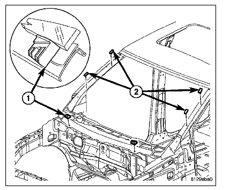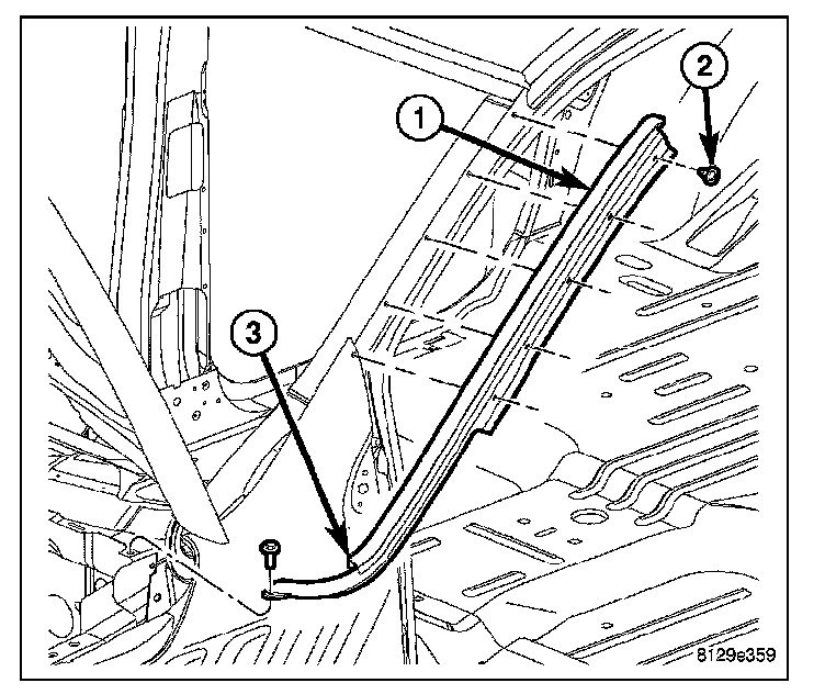 2. Remove the screws (2) attaching the side windshield molding (1) to the a-pillars and remove the molding.