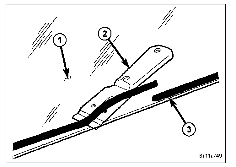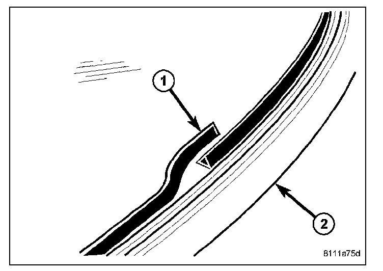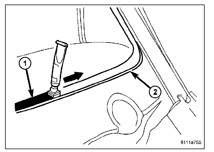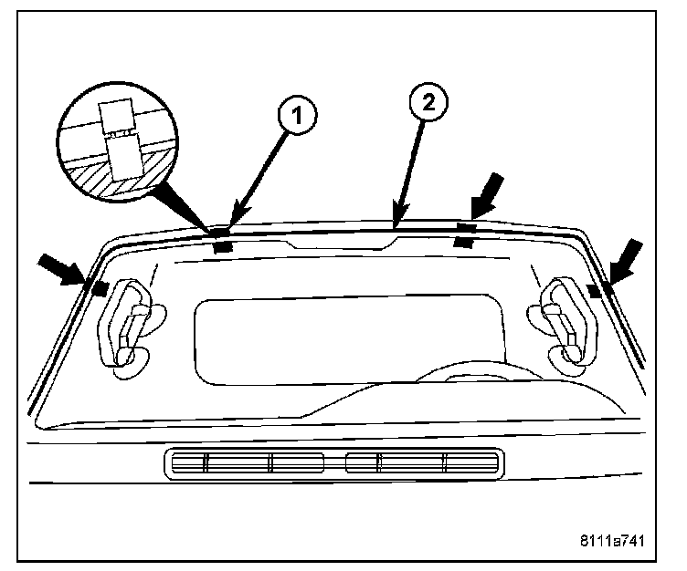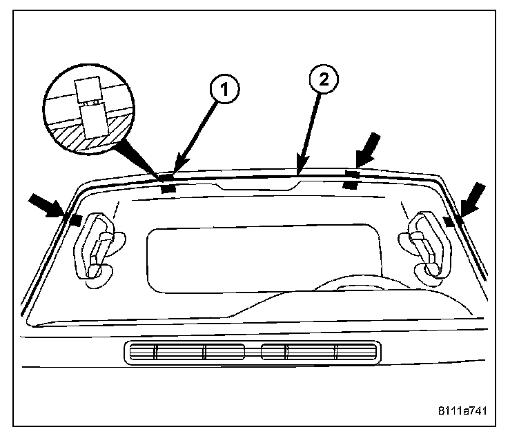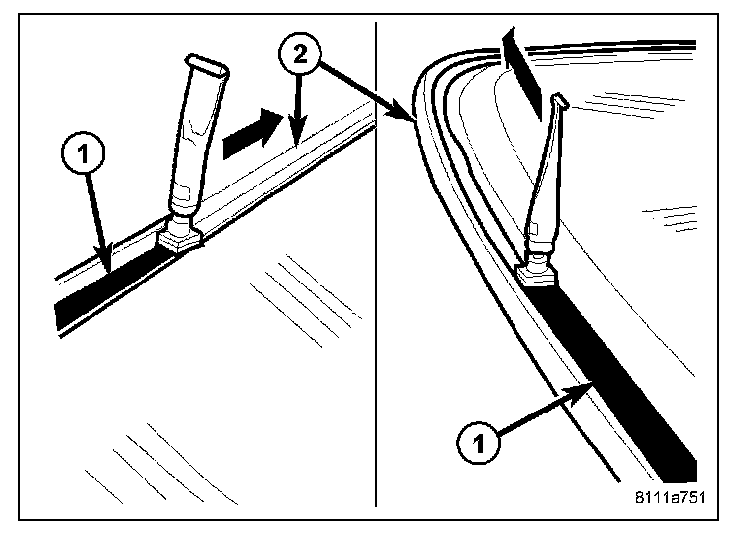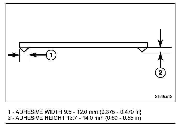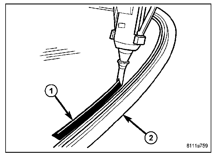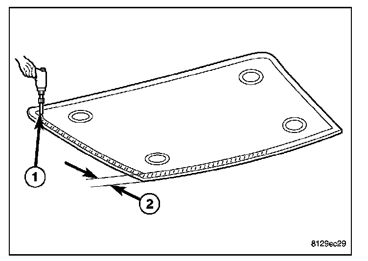 1. Apply bead of adhesive (1) with a triangular nozzle directly to the windshield seal starting at bottom in center of windshield.