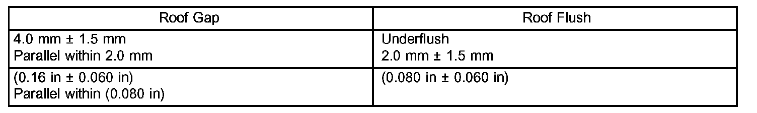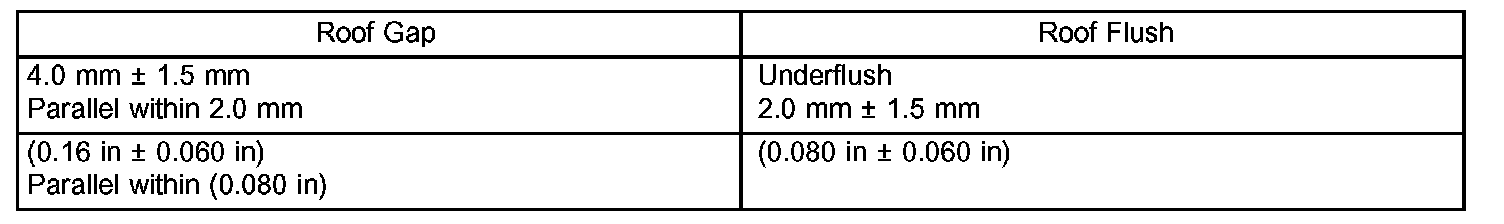 4. Adjust the lower spacers (3) as required, to obtain the specified roof gap tolerance by pushing on the side of the wedge and raising or lowering the glass as necessary. For roof gap specifications, refer to Body and Frame / Specifications.