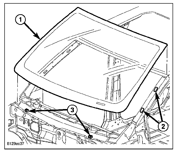 3. Position windshield (1) in center of windshield opening and resting on the side and lower spacers (2 & 3).