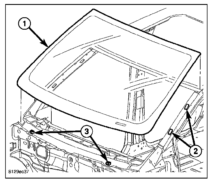 5. Position windshield (1) in center of windshield opening and resting on the side and lower spacers (2 & 3).