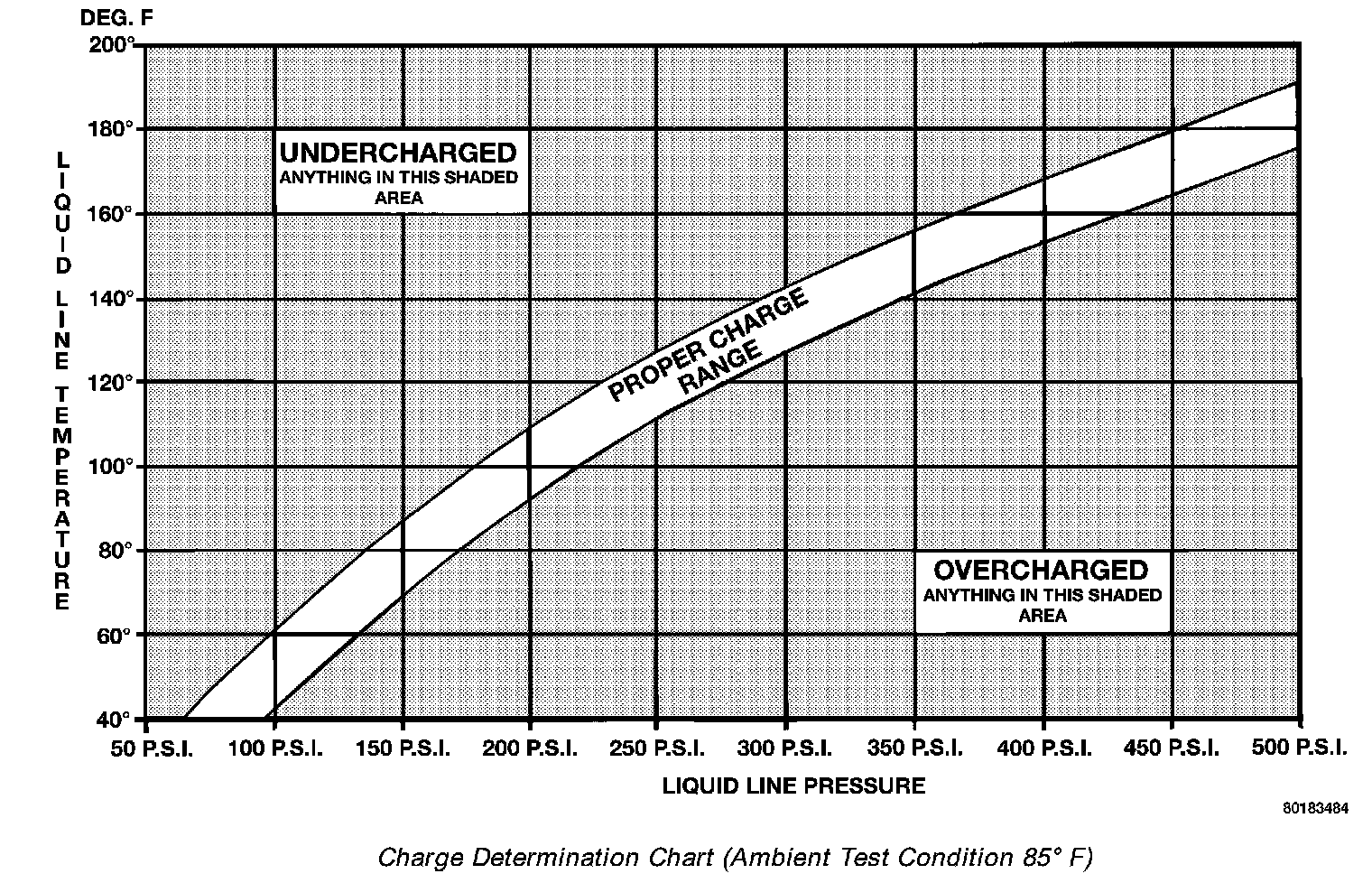 5. Observe the liquid line (discharge) pressure and liquid line temperature. Using the Charge Determination Chart, determine whether the refrigerant system is operating within the Proper Charge Range.