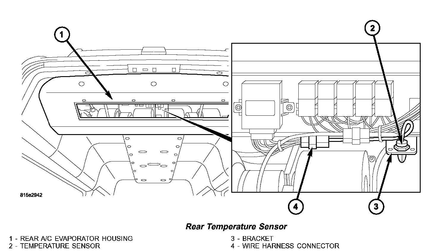 3. Reach up into the rear A/C evaporator housing and disconnect the wire harness connector from the rear temperature sensor.