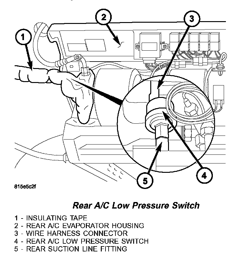 NOTE: Replacement of the PTFE thread sealing tape is required anytime the rear A/C low pressure switch is removed from the rear suction line line. Failure to replace the sealing tape could result in a rear refrigerant system leak.