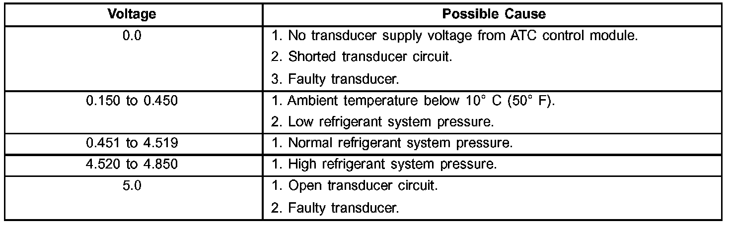 The A/C pressure transducer is tested using a DRBIII(R) scan tool. Refer to Body Diagnostic Procedures. Before testing the A/C pressure transducer, be certain that the transducer wire harness connections are clean of corrosion and properly connected. For the air conditioning system to operate, an A/C pressure transducer voltage reading between 0.7 and 4.56 volts is required. Voltage outside this range indicate a low or high refrigerant system pressure condition to the ATC control module. The control module is programmed to respond to a low or high refrigerant system pressure by suppressing operation of the compressor. Refer to the A/C Pressure Transducer Voltage chart for the possible condition indicated by the transducer voltage readings.