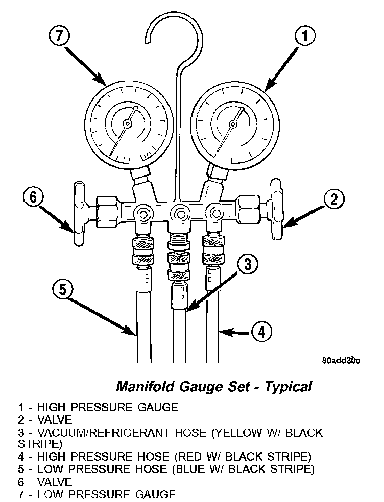 A manifold gauge set may be needed with some recovery/recycling/charging equipment. The service hoses on the gauge set being used should have manual (turn wheel), or automatic back-flow valves at the service port connector ends. This will prevent refrigerant from being released into the atmosphere.