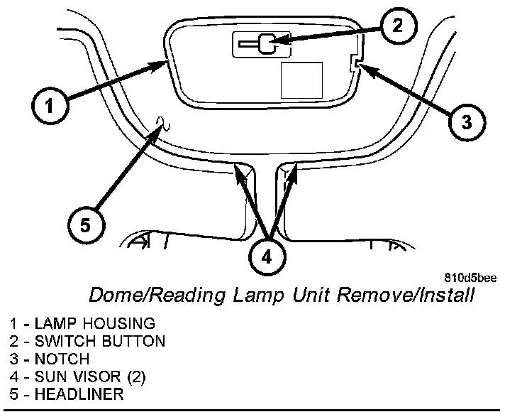 2. Insert the tip of a small flat-bladed screwdriver into the notch on one edge of the dome/reading lamp housing to depress the retainer clip and pull that edge of the lamp away from its mounting location.