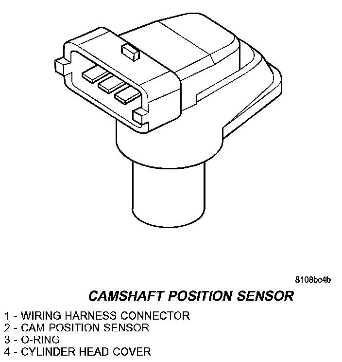 The camshaft position sensor is mounted on the cylinder head cover toward the rear of the engine. The camshaft sensor utilizes a non contact method on one segment of the camshaft to record the camshaft position. When the ECM receives the signal from this sensor, it can then detect TDC of cylinder number one. The signal from the camshaft sensor is only required during engine starting. Injection timing is synchronized by means of the camshaft signal and the crankshaft signal.Camshaft Position Sensor: