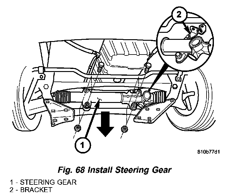 g. Install the steering gear (1) (Fig. 68) onto the chassis crossmember. Tighten both steering gear bolts first to 25 Nm (18.5 ft. lbs.). Tighten both steering gear bolts next to 45 Nm (33 ft. lbs.). Tighten both steering gear bolts next an additional 90°.
