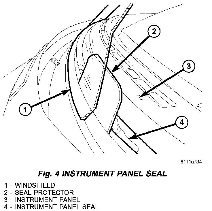 5. Place protection guard between windshield and instrument panel seal. (Fig. 4)