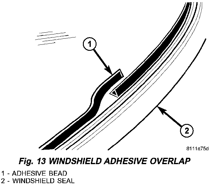 1. Apply bead of glue with a triangular nozzle directly to the windshield seal starting at bottom in center of windshield. (Fig. 12)