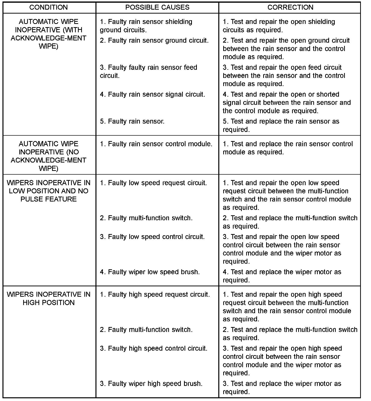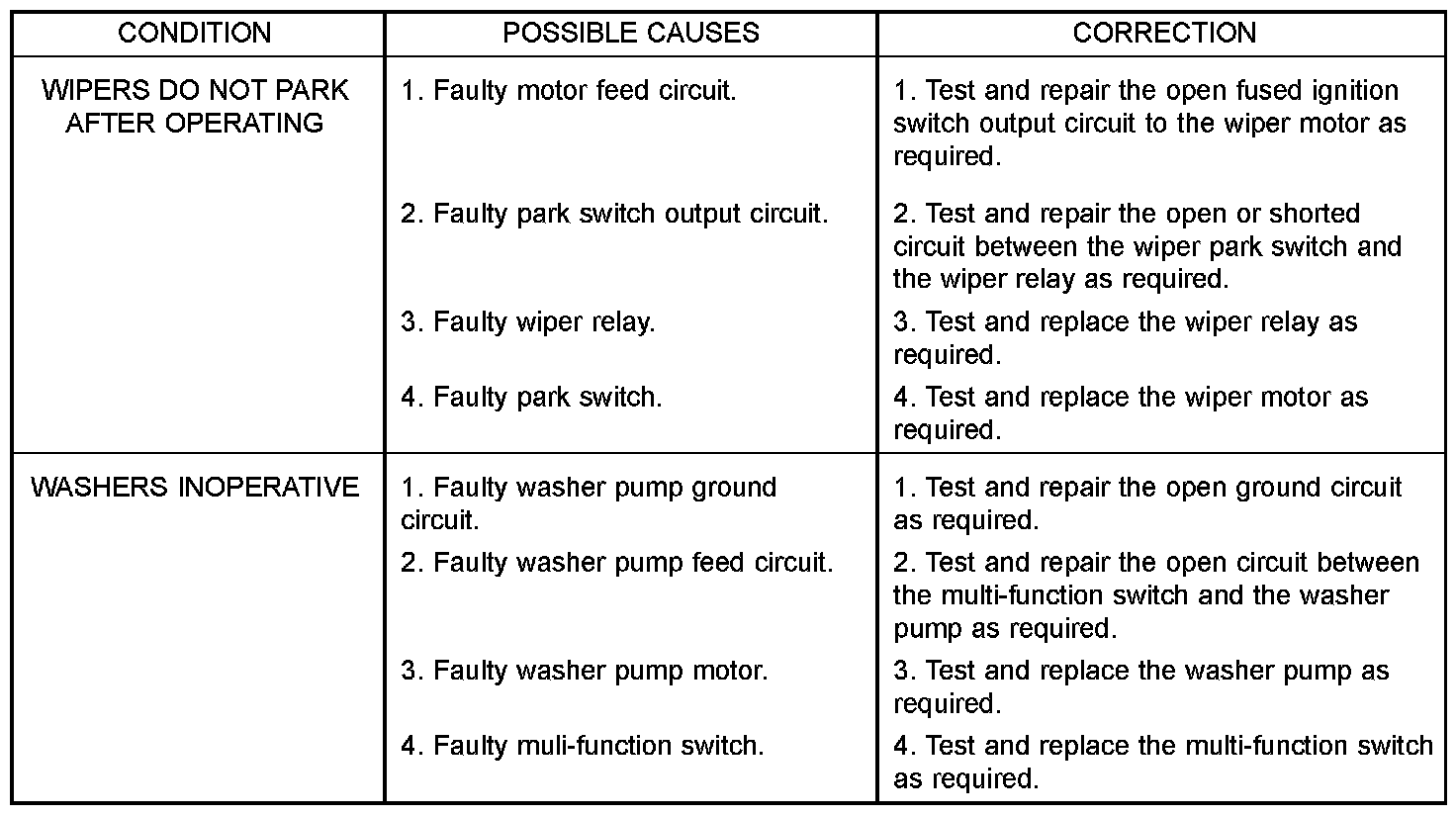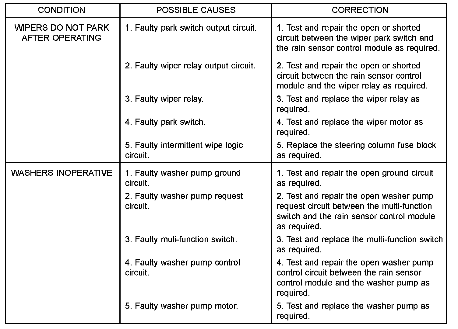 If the wiper motor operates, but the wipers do not move on the windshield, replace the faulty wiper linkage module. If the washer pump/motor operates, but no washer fluid is dispensed on the glass; or, if the wipers operate, but chatter, lift, or do not clear the glass, clean and inspect the wiper and washer system components as required. For diagnosis and testing of the multi-function switch Refer to the appropriate wiring information. The wiring information includes wiring diagrams, proper wire and connector repair procedures, details of wire harness routing and retention, connector pin-out information and location views for the various wire harness connectors, splices and grounds.The hard wired circuits and components of the wiper and washer system may be diagnosed and tested using conventional diagnostic tools and procedures. However, conventional diagnostic methods may not prove conclusive in the diagnosis of the intermittent wipe logic circuitry contained within the fuse block underneath the steering column, the rain sensor within the base of the rear view mirror on the windshield, or the rain sensor control module under the instrument panel.