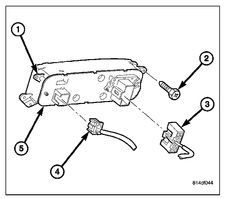 3. Connect the wire harness connectors (3 and 4) to the back of the A/C-heater control (5) and install the instrument panel center bezel.