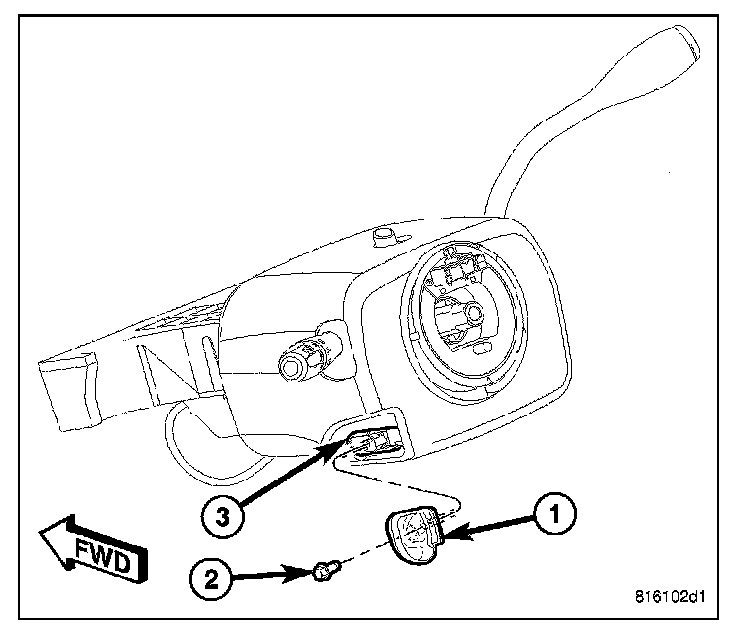 2. Remove the screw (2) that secures the tilt steering column knob (1) and remove it from the tilt actuator (3) on the left side of the column.