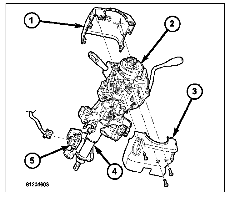 3. From below the steering column, remove the two outboard screws that secure the upper column shroud (1) to the lower shroud (3).