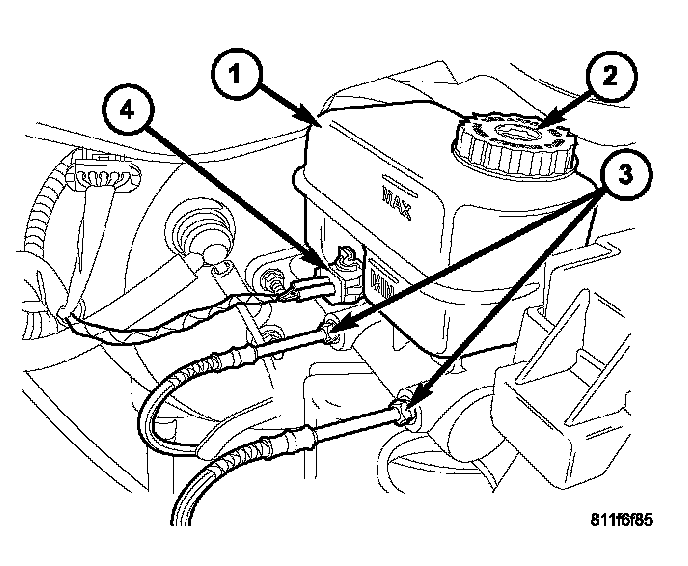 The fluid fill level is indicated on the side of the master cylinder reservoir (1).